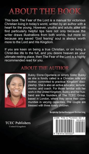 "She explains God, not as a concept, but as the 'Eternal Being' we can safely relate with and love." - Apostle John-Paul Okwok, President of City of Life Ministries In The Fear of the Lord, author Bukky Ekine-Ogunlana draws on 14 years of Christian faith-based experience working with children, teenagers and adults and personal devotion to God's word to offer Christians inspirational guidance, so that anyone can find peace by fearing God and living through Jesus. Perhaps most valuable to Christians who yearn to walk God's path, the author offers valuable Bible interpretation and uses popular Holy Bible events to help illustrate how Christian youths and adults can overcome temptations in potential pitfalls in today's world. In this book, you will learn how fearing God and living according to God's example can help teens and adults deal with even the most difficult of life's problems:Understanding God and following Jesus - powerful tips for hearing God The importance of obeying God and being a God-fearing Christian How to overcome fear and live your life to the fullest Proven parenting skills reinforced by Scripture and living in God's image The strength provided by Christian prayer and fasting Is the Bible true? Understanding common misinterpretations of the Bible and having confidence in the truth of Scripture, almost 2,000 years after the first Bible was written Defining sin and identifying evil - how to avoid them How to avoid the temptations of adultery and seduction - the pleasures of sin are fleeting, and God is all-knowing The Fear of the Lord is a manual for victorious Christian living in today's world written by an author with a heart for the young. Youths and adults as well, will find particularly helpful tips here not only because the writer draws illustrations from their world, but more so because a saved child or youth is worth more for God's Kingdom. If you are keen on being a true Christian, or on living the life of Christ, and you want to find heaven as your final resting place, then this inspirational Christian book is a highly recommended read. Page Up and Order Now.
