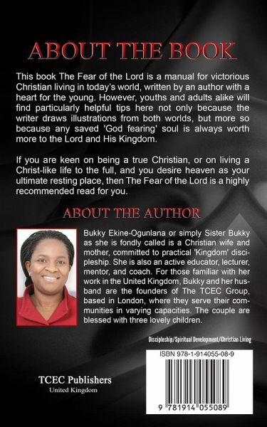 "She explains God, not as a concept, but as the 'Eternal Being' we can safely relate with and love." - Apostle John-Paul Okwok, President of City of Life Ministries In The Fear of the Lord, author Bukky Ekine-Ogunlana draws on 14 years of Christian faith-based experience working with children, teenagers and adults and personal devotion to God's word to offer Christians inspirational guidance, so that anyone can find peace by fearing God and living through Jesus. Perhaps most valuable to Christians who yearn to walk God's path, the author offers valuable Bible interpretation and uses popular Holy Bible events to help illustrate how Christian youths and adults can overcome temptations in potential pitfalls in today's world. In this book, you will learn how fearing God and living according to God's example can help teens and adults deal with even the most difficult of life's problems:Understanding God and following Jesus - powerful tips for hearing God The importance of obeying God and being a God-fearing Christian How to overcome fear and live your life to the fullest Proven parenting skills reinforced by Scripture and living in God's image The strength provided by Christian prayer and fasting Is the Bible true? Understanding common misinterpretations of the Bible and having confidence in the truth of Scripture, almost 2,000 years after the first Bible was written Defining sin and identifying evil - how to avoid them How to avoid the temptations of adultery and seduction - the pleasures of sin are fleeting, and God is all-knowing The Fear of the Lord is a manual for victorious Christian living in today's world written by an author with a heart for the young. Youths and adults as well, will find particularly helpful tips here not only because the writer draws illustrations from their world, but more so because a saved child or youth is worth more for God's Kingdom. If you are keen on being a true Christian, or on living the life of Christ, and you want to find heaven as your final resting place, then this inspirational Christian book is a highly recommended read. Page Up and Order Now.