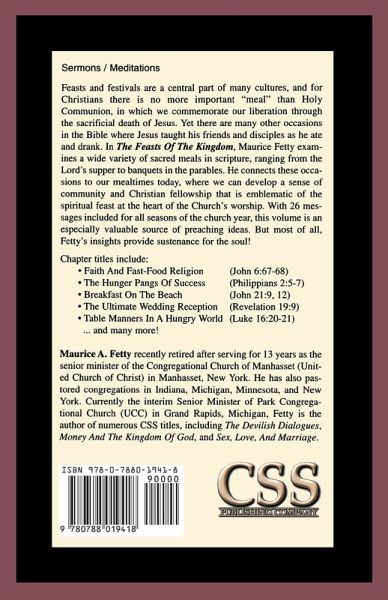 Feasts and festivals are a central part of many cultures, and for Christians there is no more important "meal" than Holy Communion, in which we commemorate our liberation through the sacrificial death of Jesus. Yet there are many other occasions in the Bible where Jesus taught his friends and disciples as he ate and drank. In The Feasts Of The Kingdom, Maurice Fetty examines a wide variety of sacred meals in scripture, ranging from the Lord's supper to banquets in the parables. He connects these occasions to our mealtimes today, where we can develop a sense of community and Christian fellowship that is emblematic of the spiritual feast at the heart of the church's worship. With 26 messages included for all seasons of the church year, this volume is an especially valuable source of preaching ideas. But most of all, Fetty's insights provide sustenance for the soul! Chapter titles include: • Faith and Fast-Food Religion (John 6:67-68) • The Hunger Pangs of Success (Philippians 2:5-7) • Breakfast on the Beach (John 21:9, 12) • The Ultimate Wedding Reception (Revelation 19:9) • Table Manners in a Hungry World (Luke 16:20-21) ... and many more! Maurice A. Fetty recently retired after serving for thirteen years as the senior minister of the Congregational Church of Manhasset (United Church of Christ) in Manhasset, New York. He has also pastored congregations in Indiana, Michigan, Minnesota, and New York. Currently the interim Senior Minister of Park Congregational Church (UCC) in Grand Rapids, Michigan, Fetty is the author of numerous CSS titles, including The Devilish Dialogues, Money And The Kingdom Of God, and Sex, Love, And Marriage.