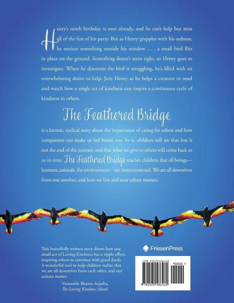 Henry's ninth birthday is over already, and he can't help but miss all of the fun of his party. But as Henry grapples with his sadness, he notices something outside his window . . . a small bird flits in place on the ground. Something doesn't seem right, so Henry goes to investigate. When he discovers the bird is struggling, he's filled with an overwhelming desire to help. Join Henry as he helps a creature in need and watch how a single act of kindness can inspire a continuous cycle of kindness in others. The Feathered Bridge is a karmic, cyclical story about the importance of caring for others and how compassion can make us feel better, too. In it, children will see that loss is not the end of the journey, and that what we give to others will come back to us in time. The Feathered Bridge teaches children that all beings-humans, animals, the environment-are interconnected. We are all downriver from one another, and how we live and treat others matters.