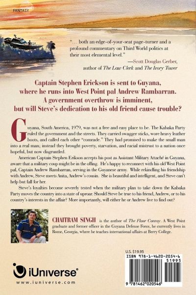 "... both an edge-of-your-seat page-turner and a profound commentary on Third World politics at their most elemental level." -Scott Douglas Gerber, author of The Law Clerk and The Ivory Tower Captain Stephen Erickson is sent to Guyana, where he runs into West Point pal Andrew Rambarran. A government overthrow is imminent, but will Steve's dedication to his old friend cause trouble? Guyana, South America, 1979, was not a free and easy place to be. The Kabaka Party ruled the government and the streets. They carried swagger sticks, wore heavy leather boots, and called each other "comrade." They had promised to make the small man into a real man; instead they brought poverty, starvation, and racial mistrust to a nation once hopeful, but now disgruntled. American Captain Stephen Erikson accepts his post as Assistant Military Attaché in Guyana, aware that a military coup might be in the offing. He's happy to reconnect with his old West Point pal, Captain Andrew Rambarran, serving in the Guyanese army. While rekindling his friendship with Andrew, Steve meets Anita, Andrew's cousin. She is beautiful and intelligent, and Steve can't help but fall for her. Steve's loyalties become severely tested when the military plan to take down the Kabaka Party moves the country into a state of uproar. Should Steve be true to his friend, Andrew, or to his country's interests in the affair? More importantly, will either he or Andrew live to find out?