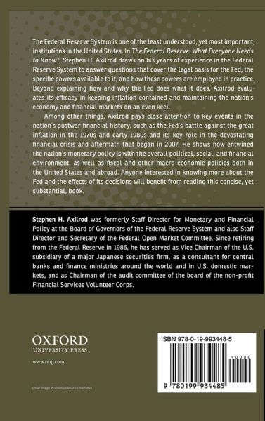 The Federal Reserve System--the central bank of the United States, better known as The Fed--has never been more controversial. Criticism has reached such levels that Congressman Ron Paul, contender for the Republican presidential nomination in 2012, published End the Fed, with blurbs from musician Arlo Guthrie and actor Vince Vaughn. And yet, amid a slow economy and partisan gridlock, the Fed has never been more important. Stephen H. Axilrod explains this influential agency-its powers, operations, how it sets policy-in The Federal Reserve, a timely addition to Oxford's acclaimed series What Everyone Needs to Know. Of the two major governmental tools for shaping the economy, Congress controls fiscal policy-taxation and spending-and the Fed makes monetary policy-influencing how much money circulates in the economy, and how quickly. Traditionally the Fed has relied on three instruments: open-market operations (buying and selling U.S. bonds), lending to banks, and setting reserve requirements on bank deposits. It also helps to regulate the financial system. Drawing on years of experience inside the Federal Reserve System, Axilrod shows how these tools actually work, and answers a series of increasingly detailed questions in the series format. He asks, for instance, if the system of regional Fed banks needs modification for today's technological landscape; if there is corruption in the Fed's governance; what happens to profits from its operations; the impact of political pressure; the extent of Congressional oversight; and just how independent it truly is. Whether discussing the Fed's balance sheet through the financial crisis of 2008 and beyond, the federal funds rate, or the international context, Axilrod displays a mastery of his subject Coming in time for the Fed's 100th anniversary in 2013, this book deftly explains an institution that every American needs to understand.