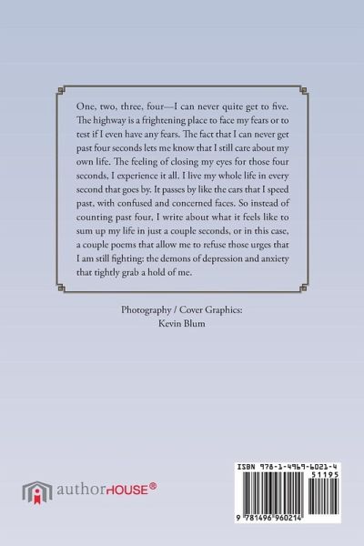 One, two, three, four-I can never quite get to five. The highway is a frightening place to face my fears or to test if I even have any fears. The fact that I can never get past four seconds lets me know that I still care about my own life. The feeling of closing my eyes for those four seconds, I experience it all. I live my whole life in every second that goes by. It passes by like the cars that I speed past, with confused and concerned faces. So instead of counting past four, I write about what it feels like to sum up my life in just a couple seconds, or in this case, a couple poems that allow me to refuse those urges that I am still fighting: the demons of depression and anxiety that tightly grab a hold of me.