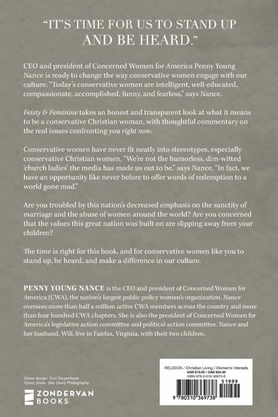 CEO and president of Concerned Women for America Penny Young Nance is ready to change the way women today engage the culture. "Today's conservative women are intelligent, well-educated, compassionate, accomplished, funny, and fearless," says Nance. Feisty & Feminine takes an honest and transparent look at what it means to be a conservative Christian woman, with thoughtful commentary on the real issues confronting you right now. Conservative Christian women have never fit neatly into stereotypes. "We're not the humorless, dim-witted 'church ladies' Saturday Night Live has made us out to be," says Nance. "In fact, we have an opportunity like never before to offer words of redemption to a world gone mad." Are you troubled by this nation's decreased emphasis on the sanctity of marriage and the abuse of women around the world? Are you concerned that the values of this great nation are slipping away from your children? The time is right for this book, and for conservative women--like Esther of the Bible--to stand up, be heard, and make a difference in our culture.