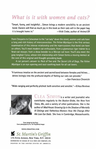 What is it with women and cats? The Feline Mystique is the first serious examination of the intense relationship between woman and their cats and of the repercussions that bond can have on others. Richly researched and searchingly personal, The Feline Mystique uses history, science, art, and literature as touchpoints to explain and explore contemporary women's lives with their cats. From a glamorous tiger trainer to a feral-cat rescuer, from a show breeder to Simon and her own relationship with the gray longhair Cyrus, this book will introduce you to women both ferocious and nurturing and animals both whimsical and noble. It's a fresh, fascinating exploration of the timeless bond between women and cats, and will deepen your understanding of your relationship with your own feline-be he or she tiger or tabby. A cat person's answer to Pack of Two and The Secret Life of Dogs, The Feline Mystique is an eye-opening and soul-soothing book for all cat lovers.
