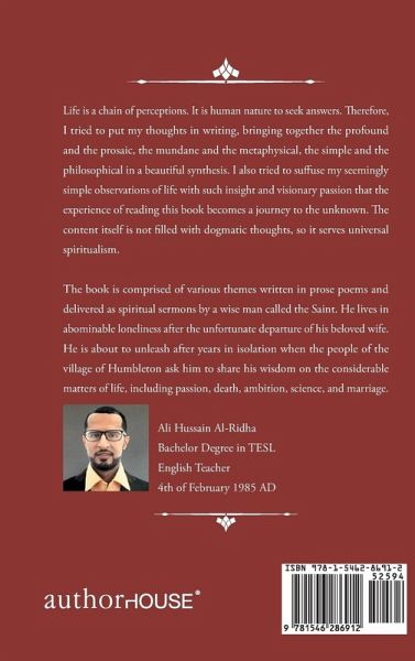 Life is a chain of perceptions. It is human nature to seek answers. Therefore, I tried to put my thoughts in writing, bringing together the profound and the prosaic, the mundane and the metaphysical, the simple and the philosophical in a beautiful synthesis. I also tried to suffuse my seemingly simple observations of life with such insight and visionary passion that the experience of reading this book becomes a journey to the unknown. The content itself is not filled with dogmatic thoughts, so it serves universal spiritualism. The book is comprised of various themes written in prose poems and delivered as spiritual sermons by a wise man called the Saint. He lives in abominable loneliness after the unfortunate departure of his beloved wife. He is about to unleash after years in isolation when the people of the village of Humbleton ask him to share his wisdom on the considerable matters of life, including passion, death, ambition, science, and marriage. Ali Hussain Al-Ridha Bachelor Degree in TESL English Teacher 4th of February 1985 AD
