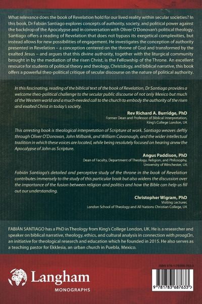 What relevance does the book of Revelation hold for our lived reality within secular societies? In this book, Dr Fabián Santiago explores concepts of authority, society, and political power against the backdrop of the Apocalypse and in conversation with Oliver O'Donovan's political theology. Santiago offers a reading of Revelation that does not bypass its exegetical complexities, but instead allows for new possibilities of engagement. He investigates the conception of authority presented in Revelation - a conception centered on the throne of God and transformed by the exalted Jesus - and argues that this divine authority ultimately correlates with the Fellowship of the Throne, a liturgical community mediated by the risen Christ. An excellent resource for students of political theory and theology, Christology, and biblical narrative, this book offers a powerful theo-political critique of secular discourse on the nature of political authority.