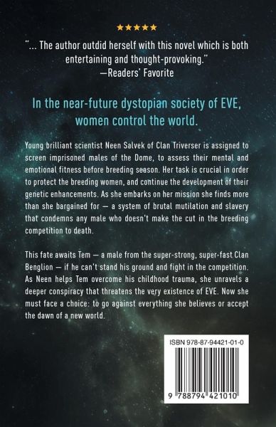 In the near-future dystopian society of EVE, women control the world. If you liked The Power by N. Alderman and The Handmaid's Tale by M. Atwood, you won't be disappointed. Young brilliant scientist Neen Salvek of Clan Triverser is assigned to screen imprisoned males of the Dome, to assess their mental and emotional fitness before breeding season. Her task is crucial in order to protect the breeding women, and continue the development of their genetic enhancements. As she embarks on her mission she finds more than she bargained for - a system of brutal mutilation and slavery that condemns any male who doesn't make the cut in the breeding competition to death. This fate awaits Tem - a male from the super-strong, super-fast Clan Benglion - if he can't stand his ground and fight in the competition. As Neen helps Tem overcome his childhood trauma, she unravels a deeper conspiracy that threatens the very existence of EVE. Now she must face a choice: to go against everything she believes or accept the dawn of a new world.