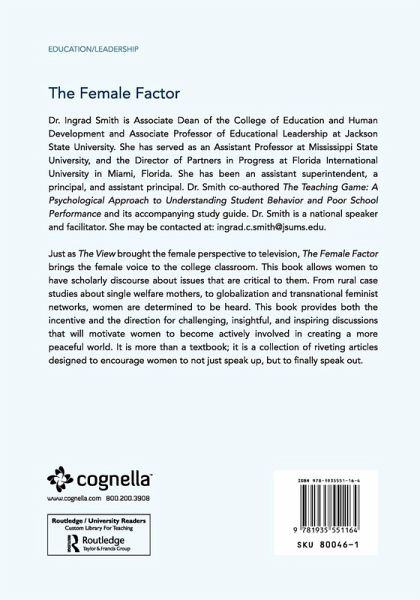 Just as The View brought the female perspective to television, The Female Factor brings the female voice to the college classroom. This book allows women to have scholarly discourse about issues that are critical to them. From rural case studies about single welfare mothers, to globalization and transnational feminist networks, women are determined to be heard. This book provides both the incentive and the direction for challenging, insightful, and inspiring discussions that will motivate women to become actively involved in creating a more peaceful world. It is more than a textbook; it is a collection of riveting articles designed to encourage women to not just speak up, but to finally speak out. Dr. Ingrad Smith is Associate Dean of the College of Education and Human Development and Associate Professor of Educational Leadership at Jackson State University. She has served as an Assistant Professor at Mississippi State University, and the Director of Partners in Progress at Florida International University in Miami, Florida. She has been an assistant superintendent, a principal, and assistant principal. Dr. Smith co-authored The Teaching Game: A Psychological Approach to Understanding Student Behavior and Poor School Performance and its accompanying study guide. Dr. Smith is a national speaker and facilitator. She may be contacted at: ingrad.c.smith@jsums.edu.