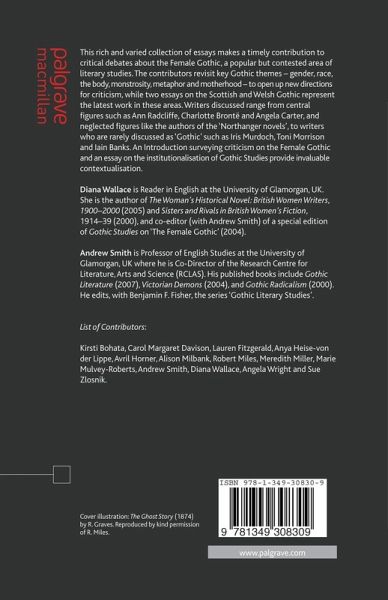 DIANA WALLACE is Reader in English at the University of Glamorgan, UK. She is the author of The Woman's Historical Novel: British Women Writers, 1900-2000 (2005) and Sisters and Rivals in British Women's Fiction, 1914-39 (2000), and co-editor (with Andrew Smith) of a special edition of Gothic Studies on 'The Female Gothic' (2004). ANDREW SMITH is Professor of English Studies at the University of Glamorgan, UK where he is Co-Director of the Research Centre for Literature, Arts and Science (RCLAS). Published books include Gothic Literature (2007), Victorian Demons (2004), and Gothic Radicalism (2000). He edits, with Benjamin F. Fisher, the series 'Gothic Literary Studies', for the University of Wales Press.