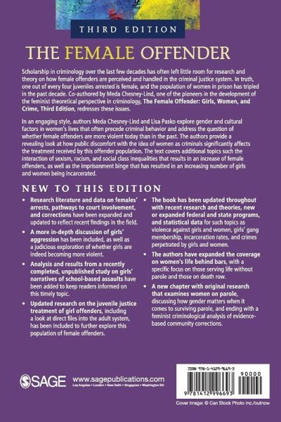 Scholarship in criminology over the last few decades has often left little room for research and theory on how female offenders are perceived and handled in the criminal justice system. In truth, one out of every four juveniles arrested is female and the population of women in prison has tripled in the past decade. Co-authored by Meda Chesney-Lind, one of the pioneers in the development of the feminist theoretical perspective in criminology, the subject matter of The Female Offender: Girls, Women and Crime, Third Edition redresses the balance by providing critical insight into these issues. In an engaging style, authors Meda Chesney-Lind and Lisa Pasko explore gender and cultural factors in women's lives that often precede criminal behavior and address the question of whether female offenders are more violent today than in the past. The authors provide a revealing look at how public discomfort with the idea of women as criminals significantly impacts the treatment received by this offender population.