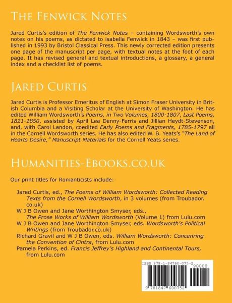 In 1843 William Wordsworth dictated invaluable notes on his life's work to his friend Isabella Fenwick. In 1993 Jared Curtis published his invaluable edition of these notes (which are not included in The Prose Works of William Wordsworth). This revised and corrected edition of The Fenwick Notes was published 2008. To receive a free accompanying Ebook please send proof of purchase of the paperback to Humanities-Ebooks. Please note that while colour is used in the preview, as in the ebook, the print in the paperback is black and white.