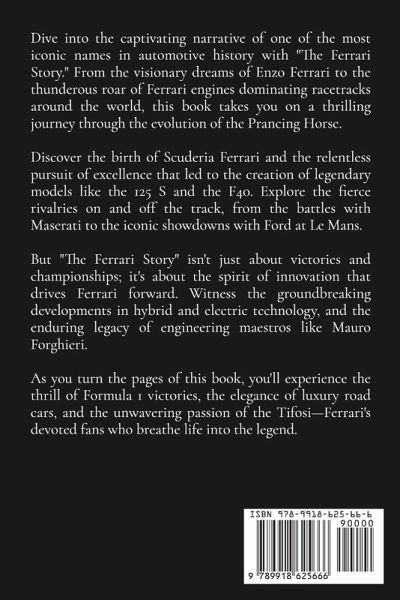 Dive into the captivating narrative of one of the most iconic names in automotive history with "The Ferrari Story." From the visionary dreams of Enzo Ferrari to the thunderous roar of Ferrari engines dominating racetracks around the world, this book takes you on a thrilling journey through the evolution of the Prancing Horse. Discover the birth of Scuderia Ferrari and the relentless pursuit of excellence that led to the creation of legendary models like the 125 S and the F40. Explore the fierce rivalries on and off the track, from the battles with Maserati to the iconic showdowns with Ford at Le Mans. But "The Ferrari Story" isn't just about victories and championships; it's about the spirit of innovation that drives Ferrari forward. Witness the groundbreaking developments in hybrid and electric technology, and the enduring legacy of engineering maestros like Mauro Forghieri. As you turn the pages of this book, you'll experience the thrill of Formula 1 victories, the elegance of luxury road cars, and the unwavering passion of the Tifosi-Ferrari's devoted fans who breathe life into the legend.