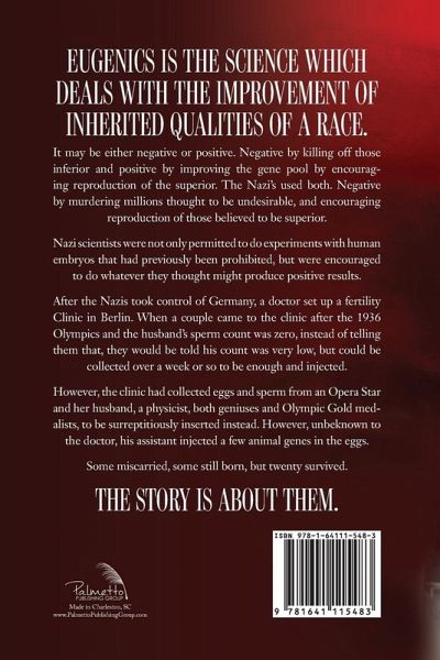 Eugenics is the science which deals with the improvement of inherited qualities of a race. It may be either negative or positive. Negative by killing off those inferior and positive by improving the gene pool by encouraging reproduction of the superior. The Nazi's used both. Negative by murdering millions thought to be undesirable, and encouraging reproduction of those believed to be superior. Nazi scientists were not only permitted to do experiments with human embryos that had previously been prohibited, but were encouraged to do whatever they thought might produce positive results. After the Nazis took control of Germany, a doctor set up a fertility Clinic in Berlin. When a couple came to the clinic after the 1936 Olympics and the husband's sperm count was zero, instead of telling them that, they would be told his count was very low, but could be collected over a week or so to be enough and injected. However, the clinic had collected eggs and sperm from an Opera Star and her husband, a physicist, both geniuses and Olympic Gold medalists, to be surreptitiously inserted instead. However, unbeknown to the doctor, his assistant injected a few animal genes in the eggs. Some miscarried, some stillborn, but twenty survived. THE STORY IS ABOUT THEM.
