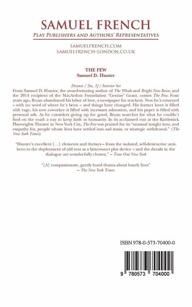From Samuel D. Hunter, the award-winning author of The Whale and A Bright New Boise, and the 2014 recipient of the MacArthur Foundation "Genius" Grant, comes The Few. Four years ago, Bryan abandoned his labor of love, a newspaper for truckers. Now he's returned - with no word of where he's been - and things have changed. His former lover is filled with rage, his new coworker is filled with incessant adoration, and his paper is filled with personal ads. As he considers giving