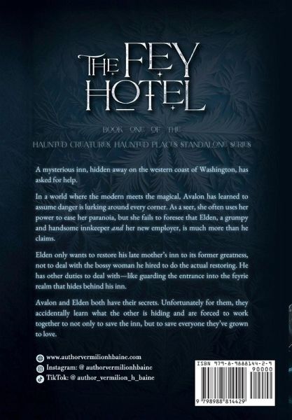 A mysterious inn, hidden away on the western coast of Washington, has asked for help. Avalon, sent to restore the failing reputation of the Refuge on the Moor, carries a secret that could lead to her own destruction. A secret she's kept since birth, and one that the grumpy, short-tempered innkeeper becomes the first to discover. Elden is the unwilling manager of a once great, and magical, hotel-that is failing under his inexperienced hand. When he reluctantly requests the help of a hotel management company, he's introduced to Avalon-someone that has more in common with him than either of them knows. They fight their past and one another, but the pair must learn to work together-not only to save the inn, but to save everyone they love. The Fey Hotel is a slow-burn, forced proximity, portal fantasy romance. Perfect for Gilmore Girls fans and lovers of fairy tales and mythology. This is the first book in a series of standalone fantasy romances, Enchanted with the Enemy. Each book features new characters, but their stories exist in the same world and around the same time. Please see the author's website for a full list of content warnings. www.authorvermilionhbaine.com