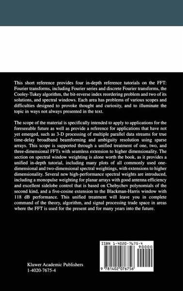 This book was undertaken to provide a text and reference on the theory and practice of the FFT and its common usage. This book is organized in only four chapters, and is intended as a tutorial on the use of the FFf and its trade space. The trade space of the FFT is the parameters in its usage and the relationships between them - the sampie rate, the total number of points or the interval over which processing occurs in a single FFf, the selectivity of tuning to a given frequency over signals out-of-band, and the bandwidth over which a signal appears. The examples given in this text are in FORTRAN 9512003. FORTRAN 2003 was frozen as a standard while this work was in progress. The listings given here are intended as an aid in understanding the FFT and associated algorithms such as spectral window weightings, with the goal of making the best of them more accessible to the reader. The code I use here provides a simple bridge between the material in the text and implementation in FORTRAN 2003, C++, Java, MATLAB ©, and other modem languages. The examples are sufficiently simple to be translated into older languages such as C and FORTRAN 77 if desired.