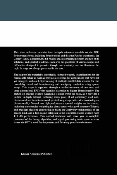 This book was undertaken to provide a text and reference on the theory and practice of the FFT and its common usage. This book is organized in only four chapters, and is intended as a tutorial on the use of the FFf and its trade space. The trade space of the FFT is the parameters in its usage and the relationships between them - the sampie rate, the total number of points or the interval over which processing occurs in a single FFf, the selectivity of tuning to a given frequency over signals out-of-band, and the bandwidth over which a signal appears. The examples given in this text are in FORTRAN 9512003. FORTRAN 2003 was frozen as a standard while this work was in progress. The listings given here are intended as an aid in understanding the FFT and associated algorithms such as spectral window weightings, with the goal of making the best of them more accessible to the reader. The code I use here provides a simple bridge between the material in the text and implementation in FORTRAN 2003, C++, Java, MATLAB ©, and other modem languages. The examples are sufficiently simple to be translated into older languages such as C and FORTRAN 77 if desired.