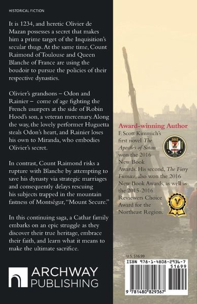 It is 1234, and heretic Olivier de Mazan possesses a secret that makes him a prime target of the Inquisition's secular thugs. At the same time, Count Raimond of Toulouse and Queen Blanche of France are using the boudoir to pursue the policies of their respective dynasties. Olivier's grandsons - Odon and Rainier - come of age fighting the French usurpers at the side of Robin Hood's son, a veteran mercenary. Along the way, the lovely performer Huguetta steals Odon's heart, and Rainier loses his own to Miranda, who embodies Olivier's secret. In contrast, Count Raimond risks a rupture with Blanche by attempting to save his dynasty via strategic marriages and consequently delays rescuing his subjects trapped in the mountain fastness of Montségur, "Mount Secure." In this continuing saga, a Cathar family embarks on an epic struggle as they discover their true heritage, embrace their faith, and learn what it means to make the ultimate sacrifice.