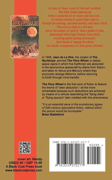 In 1908, Jean de La Hire, the creator of The Nyctalope, penned The Fiery Wheel, a classic space opera in which five Earthmen are abducted in the eponymous spacecraft by aliens from Saturn, and taken to Venus and Mercury where they encounter strange lifeforms, before returning to Earth through mind transfer. The Fiery Wheel is the first work of fiction to feature the theme of "alien abduction," all the more remarkable because such abductions are achieved by means of a vehicle resembling the "flying disks" or "flying saucers" later credited with this phenomena."It is an essential piece in the evolutionary jigsaw of 20th century speculative fiction, without which the picture would be incomplete."-- Brian Stableford.