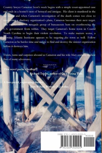 Country lawyer Cameron Scott's week begins with a nightmare and ends in a hornet's nest of betrayal and intrigue. A small group of mid-level bureaucrats has formed a secret alliance to quietly restructure the U.S. government from within but a power-hungry cadre, intent on changing the government through violent revolution, has seized the organization and quickly eliminated its founders. Like weeds in a garden, they have spread through the government. Cameron crosses paths with the shadowy organization, and an equally shadowy FBI agent, trying to find out why his court-appointed client was murdered in the jailhouse, and suddenly finds himself in their crosshairs. When he learns that the treacherous group and a raging category five hurricane may both center their destruction on his coastal home town of Riverport, NC,he is forced to fight time and nature to seek and destroy the organization before it destroys him.