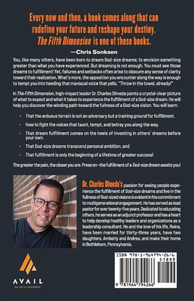 Every now and then, a book comes along that can redefine your future and reshape your destiny. The Fifth Dimension is one of those books. -Chris SonksenYou, like many others, have been born to dream God-size dreams; to envision something greater than what you have experienced. But dreaming is not enough. You must see those dreams to fulfillment! Yet, failures and setbacks often arise to obscure any sense of clarity toward their realization. What's more, the opposition you encounter along the way is enough to tempt you into heeding that maniacal voice that yells, "Throw in the towel, already!" In The Fifth Dimension, high-impact leader Dr. Charles Olmeda paints a crystal-clear picture of what to expect and what it takes to experience the fulfillment of a God-size dream. He will help you discover the winding path toward the fullness of a God-size vision. You will learn:That the arduous terrain is not an adversary but a training ground for fulfillment. How to fight the voices that taunt, tempt, and betray you along the way. That dream fulfillment comes on the heels of investing in others' dreams before your own. That God-size dreams transcend personal ambition, and That fulfillment is only the beginning of a lifetime of greater success! The greater the pain, the closer you are. Press on-the fulfillment of a God-size dream awaits you!