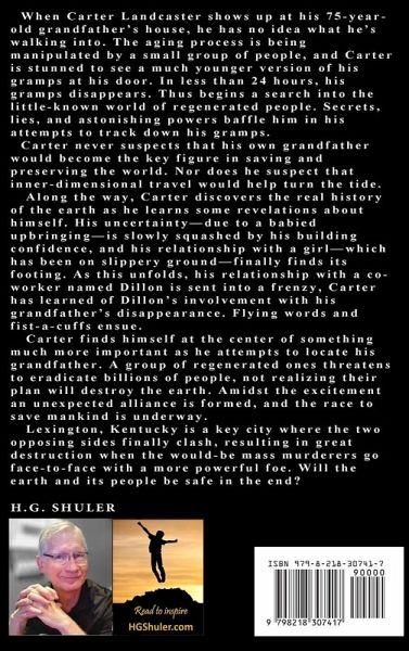 When Carter Landcaster shows up at his 75-year-old grandfather's house, he has no idea what he's walking into. The aging process is being manipulated by a small group of people, and Carter is stunned to see a much younger version of his gramps at his door. In less than 24 hours, his gramps suddenly disappears. Thus, begins a search into the little-known world of regenerated people. Secrets, lies, and astonishing powers baffle him in his attempts to track down his gramps. Carter never suspected that his own grandfather would become the key figure in saving and preserving the world. Nor does he suspect that inter-dimensional travel would help turn the tide. Along the way, Carter discovers the real history of the earth as he learns some revelations about himself. His uncertainty--due to a babied upbringing--is slowly squashed by a building confidence, and his relationship with a girl--which has been on slippery ground--finally finds its footing. As this unfolds, his relationship with a co-worker named Dillon is sent into a frenzy when he learns of his involvement with his grandfather's disappearance. Flying words and fist-a-cuffs ensue. During his attempts to locate his grandfather, Carter finds himself at the center of something much more important: A group of regenerated ones threaten to eradicate billions of people, not realizing that their plan will destroy the earth. Amidst the excitement and unexpected alliance is formed, and the race to save mankind is underway. Lexington, Kentucky is a key city where the two opposing sides finally clash, resulting in great destruction when the would-be mass murderers go face-to-face with a more powerful foe. Will the earth and its people be safe in the end?