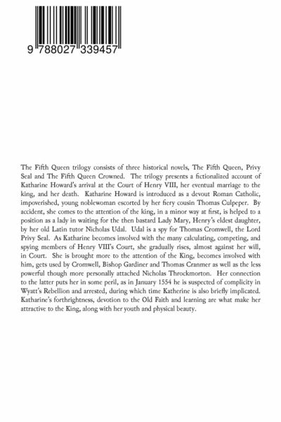 The Fifth Queen trilogy consists of three historical novels, The Fifth Queen, Privy Seal and The Fifth Queen Crowned. The trilogy presents a fictionalized account of Katharine Howard's arrival at the Court of Henry VIII, her eventual marriage to the king, and her death. Katharine Howard is introduced as a devout Roman Catholic, impoverished, young noblewoman escorted by her fiery cousin Thomas Culpeper. By accident, she comes to the attention of the king, in a minor way at first, is helped to a position as a lady in waiting for the then bastard Lady Mary, Henry's eldest daughter, by her old Latin tutor Nicholas Udal. Udal is a spy for Thomas Cromwell, the Lord Privy Seal. As Katharine becomes involved with the many calculating, competing, and spying members of Henry VIII's Court, she gradually rises, almost against her will, in Court. She is brought more to the attention of the King, becomes involved with him, gets used by Cromwell, Bishop Gardiner and Thomas Cranmer as well as the less powerful though more personally attached Nicholas Throckmorton. Her connection to the latter puts her in some peril, as in January 1554 he is suspected of complicity in Wyatt's Rebellion and arrested, during which time Katherine is also briefly implicated. Katharine's forthrightness, devotion to the Old Faith and learning are what make her attractive to the King, along with her youth and physical beauty.