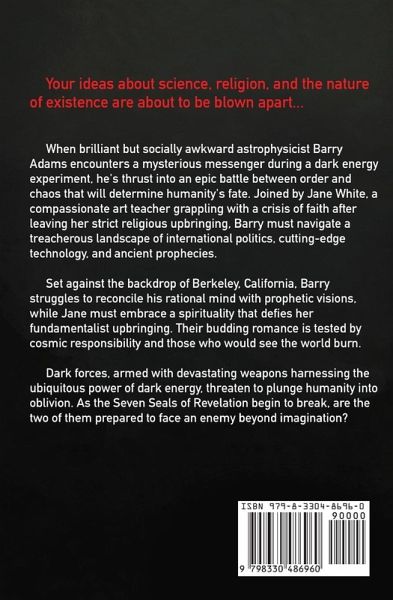 Your ideas about science, religion, and the nature of existence are about to be blown apart... The dark energy readings spiked on Barry Adams' monitor the day everything changed. One moment he was running standard calibration tests, muttering equations under his breath. The next, reality itself seemed to fracture, pulling the socially awkward astrophysicist into a war as old as creation-a cosmic battle between order and chaos with humanity's fate hanging in the balance. Joined by Jane White, a compassionate art teacher grappling with a crisis of faith after leaving her strict religious upbringing, the two must navigate a treacherous landscape of international politics, bleeding-edge technology, and ancient prophecies. Set against the backdrop of Berkeley, California, Barry struggles to reconcile his rational mind with prophetic visions, while Jane must embrace a spirituality that defies her fundamentalist upbringing. Their budding romance is tested by cosmic responsibility and those who would see the world burn. Dark forces, armed with devastating new weapons, threaten to plunge humanity into oblivion. As the Seven Seals of Revelation begin to break, are Barry and Jane prepared to face an enemy beyond imagination?
