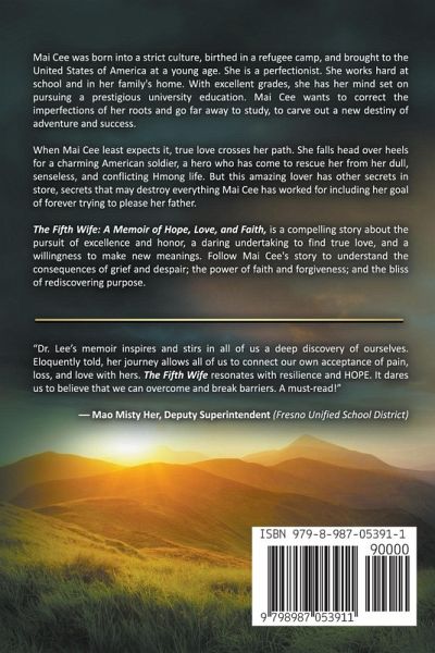 Mai Cee was born into a strict culture, birthed in a refugee camp, and brought to the United States of America at a young age. She is a perfectionist. She works hard at school and in her family's home. With excellent grades, she has her mind set on pursuing a prestigious university education. Mai Cee wants to correct the imperfections of her roots and go far away to study, to carve out a new destiny of adventure and success. When Mai Cee least expects it, true love crosses her path. She falls head over heels for a charming American soldier - a hero who has come to rescue her from her dull, senseless, and conflicting Hmong life. But this amazing lover has other secrets in store, secrets that may destroy everything Mai Cee has worked for including her goal of forever trying to please her father. The Fifth Wife: A Memoir of Hope, Love, and Faith is a compelling story about the pursuit of excellence and honor, a daring undertaking to find true love, and a willingness to make new meanings. Follow Mai Cee's story to understand the consequences of grief and despair; the power of faith and forgiveness; and the bliss of rediscovering purpose.