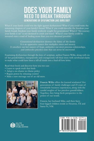 DOES YOUR FAMILY NEED TO BREAK THROUGH generations of dysfunction like ours did? What if your family could win the fight against dysfunction? What if you could write the remaining chapters of your family's future? What if you could describe the freedom your family found, freedom your family restlessly sought for generations? What if "the journey your family is on" is not destined to crash and burn? What if your family could be rerouted onto a road of healing more than you ever dreamed possible? Generational dysfunction destroys the fabric of the family. It is an oppressive cancer that multiplies stress and anxiety. It smothers our last ounces of hope, ambushes our most precious relationships, and embezzles priceless time that can never be recovered. Examining dysfunction through the lens of scripture, author Francie Willis, along with six of her grandchildren, transparently and courageously tell their story with newfound clarity to make what could have been a tell-all tirade into a heal-all love letter. Read their book and discover how you too can: Learn to speak truth that heals Adopt a no-shame no-blame policy Regain power by releasing control Make a new message out of an old mess.