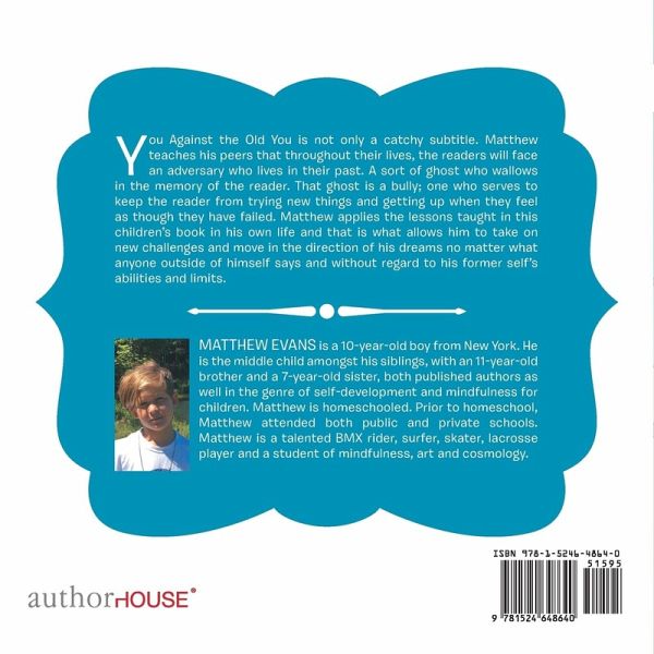 You Against the Old You is not only a catchy subtitle. Matthew teaches his peers that throughout their lives, the readers will face an adversary who lives in their past—a sort of ghost who wallows in the memory of the reader. That ghost is a bully—one who serves to keep the reader from trying new things and getting up when they feel as though they have failed. Matthew applies the lessons taught in the children’s book in his own life, and that is what allows him to take on new challenges and move in the direction of his dreams no matter what anyone outside of himself says and without regard to his former self’s abilities and limits.