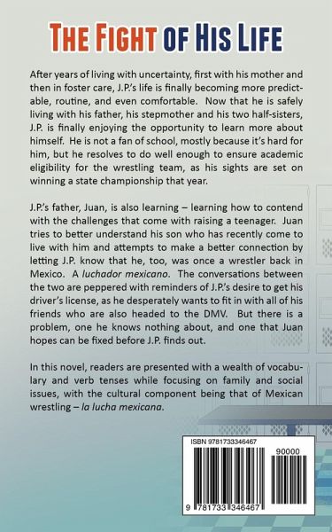 After years of living with uncertainty, first with his mother and then in foster care, J.P.'s life isfinally becoming more predictable, routine, and even comfortable. Now that he is safely livingwith his father, his stepmother and his two half-sisters, J.P. is finally enjoying the opportunity tolearn more about himself. He is not a fan of school, mostly because it's hard for him, but heresolves to do well enough to ensure academic eligibility for the wrestling team, as his sightsare set on winning a state championship that year.J.P.'s father, Juan, is also learning - learning how to contend with the challenges that come withraising a teenager. Juan tries to better understand his son who has recently come to live withhim and attempts to make a better connection by letting J.P. know that he, too, was once awrestler back in Mexico. A luchador mexicano. The conversations between the two arepeppered with reminders of J.P.'s desire to get his driver's license, as he desperately wants tofit in with all of his friends who are also headed to the DMV. But there is a problem, one heknows nothing about, and one that Juan hopes can be fixed before J.P. finds out.In this novel, readers are presented with a wealth of vocabulary and verb tenses while focusingon family and social issues, with the cultural component being that of Mexican wrestling - lalucha mexicana.