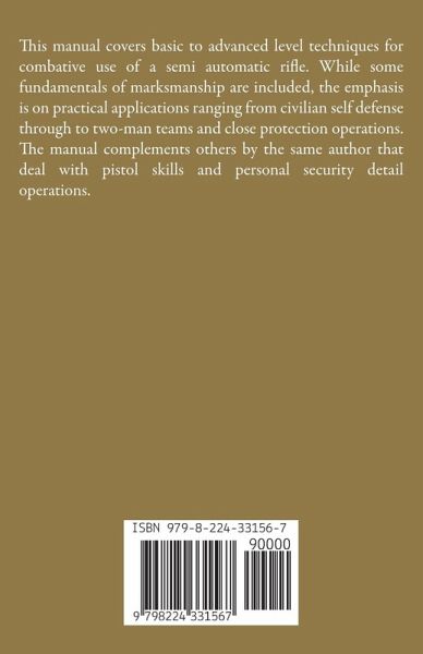 This manual covers basic to advanced level techniques for combative use of a semi automatic rifle. While some fundamentals of marksmanship are included, the emphasis is on practical applications ranging from civilian self defense through to two-man teams and close protection operations. The manual complements others by the same author that deal with pistol skills and personal security detail operations.