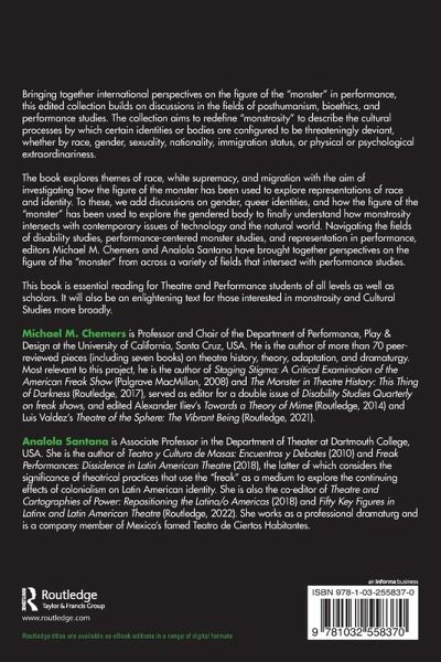 The book explores themes of race, white supremacy, and migration with the aim of investigating how the figure of the monster has been used to explore representations of race and identity. To these, we add discussions on gender, queer identities, and how the figure of the "monster" has been used to explore the gendered body to finally understand how monstrosity intersects with contemporary issues of technology and the natural world. Navigating the fields of disability studies, performance-centered monster studies, and representation in performance, editors Michael M. Chemers and Analola Santana have brought together perspectives on the figure of the "monster" from across a variety of fields that intersect with performance studies.