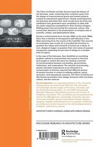 The Films of Charles and Ray Eames traces the history of the Eameses' work, examining their evolution away from the design of mass-produced goods and toward projects created as educational experiences. Closely examining how the Eameses described their work reveals how the films and exhibitions they generated were completely at odds with the earlier objectives exemplified in their furniture designs. Shifting away from promoting the consumer-culture, they turned their attention to the presentation of complex sets of scientific, artistic, and philosophical ideas. During a critical period from the late 1950s to the early 1960s there was a moment of introspective self-reflection in the West stemming from the events of the Cold War. This moment of uncertainty was crucial, for it provided the incentive to question the values and concerns of society as a whole. In turn, designers began to question their own sense of purpose, temporarily expanding the purview of design to a broader field of inquiry. In the case of the Eameses, they identified an overriding problem related to consumerism and excess in America and sought to resolve the issue by creating a network of communication between universities, governments, institutions, and corporations. The solution of promoting greater education experiences as an alternative to consumerism in America required that different sectors of society functioned in unison to address political, social, economic, and educational concerns. The Films of Charles and Ray Eames reconsiders how design intersects with humanity, culture, and the sciences.