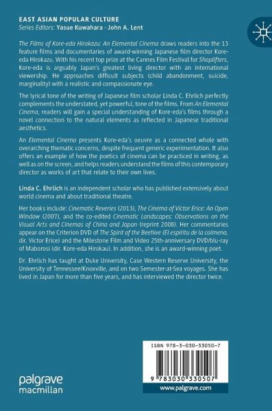 The Films of Kore-eda Hirokazu: An Elemental Cinema draws readers into the first 13 feature films and 5 of the documentaries of award-winning Japanese film director Kore-eda Hirokazu. With his recent top prize at the Cannes Film Festival for Shoplifters, Kore-eda is arguably Japan's greatest living director with an international viewership. He approaches difficult subjects (child abandonment, suicide, marginality) with a realistic and compassionate eye.The lyrical tone of the writing of Japanese film scholar Linda C. Ehrlich perfectly complements the understated, yet powerful, tone of the films. From An Elemental Cinema, readers will gain a special understanding of Kore-eda's films through a novel connection to the natural elements as reflected in Japanese traditional aesthetics.An Elemental Cinema presents Kore-eda's oeuvre as a connected whole with overarching thematic concerns, despite frequent generic experimentation. It also offers an example of how the poetics of cinema canbe practiced in writing, as well as on the screen, and helps readers understand the films of this contemporary director as works of art that relate to their own lives.