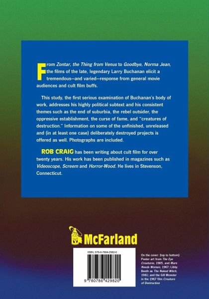 Films such as The Naked Witch, Zontar, The Thing From Venus and Mars Needs Women have gained large cult followings, and movies like A Bullet For Pretty Boy, Free, White and 21 and Goodbye, Norma Jean became box office hits. Still, no other independent filmmaker of the latter 20th century may elicit such a disparity of response from general movie audiences and cult film buffs alike as the late, legendary Larry Buchanan. This study, the first serious examination of Buchanan's body of work, addresses consistent themes such as the end of suburbia, the rebel outsider, the oppressive establishment, the curse of fame, and ""creatures of destruction."" The highly political subtext found in virtually every one of the filmmaker's projects is also explored. Chapters are devoted to more than 20 of Buchanan's films; information on some of the unfinished, unreleased (and in at least one case), deliberately destroyed projects is offered, as well. Photographs illustrating nearly all the films are included.