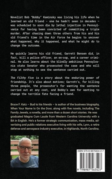 Novelist Bob "Bobby" Kaminsky was living his life when he learned an old friend he hadn't seen in decades would soon die by lethal injection in Pennsylvania for having committed a triple murder. After chasing down others from his and his friend's time in the Air Force he starts to uncover what happened, why it happened, and what he might be able to do to change the outcome. He quickly learns his old friend, Garrett Bensen did, in fact, kill a police officer, an ex-cop, and a career criminal. He also learns about the blindly ambitious Pennsylvania state Senator who prosecuted the case and who will stop at nothing to see the sentence carried out. The Filthy Five is a story about the enduring power of friendship. It's also about motives; Garrett's, for killing three people, Ed's, for wanting the sentence carried out at any cost, and Bobby's for working tirelessly to change terrible circumstances for a friend.