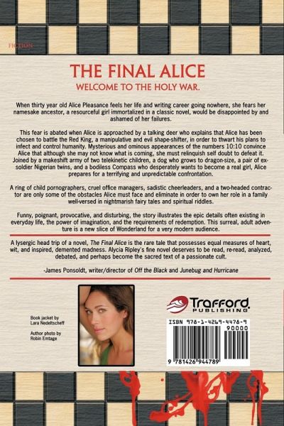 When thirty year old Alice Pleasance feels her life and writing career going nowhere, she fears her namesake ancestor, a resourceful girl immortalized in a classic novel, would be disappointed by and ashamed of her failures. This fear is abated when Alice is approached by a talking deer who explains that Alice has been chosen to battle the Red King, a manipulative and evil shape-shifter, in order to thwart his plans to infect and control humanity. Mysterious and ominous appearances of the numbers 10:10 convince Alice that although she may not know what is coming, she must relinquish self doubt to defeat it. Joined by a makeshift army of two telekinetic children, a dog who grows to dragon-size, a pair of ex-soldier Nigerian twins, and a bodiless Compass who desperately wants to become a real girl, Alice prepares for a terrifying and unpredictable confrontation. A ring of child pornographers, cruel office managers, sadistic cheerleaders, and a two-headed contractor are only some of the obstacles Alice must face and eliminate in order to own her role in a family well-versed in nightmarish fairy tales and spiritual riddles. Funny, poignant, provocative, and disturbing, the story illustrates the epic details often existing in everyday life, the power of imagination, and the requirements of redemption. This surreal, adult adventure is a new slice of Wonderland for a very modern audience. A lysergic head trip of a novel, The Final Alice is the rare tale that possesses equal measures of heart, wit, and inspired, demented madness. Alycia Ripley's fine novel deserves to be read, re-read, analyzed, debated, and perhaps become the sacred text of a passionate cult. -James Ponsoldt, writer/director of Off the Black, Smashed, and The Spectacular Now