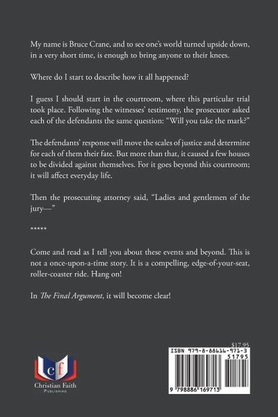 My name is Bruce Crane, and to see one's world turned upside down, in a very short time, is enough to bring anyone to their knees. Where do I start to describe how it all happened? I guess I should start in the courtroom, where this particular trial took place. Following the witnesses' testimony, the prosecutor asked each of the defendants the same question: "Will you take the mark?" The defendants' response will move the scales of justice and determine for each of them their fate. But more than that, it caused a few houses to be divided against themselves. For it goes beyond this courtroom; it will affect everyday life. Then the prosecuting attorney said, "Ladies and gentlemen of the jury-" ***** Come and read as I tell you about these events and beyond. This is not a once-upon-a-time story. It is a compelling, edge-of-your-seat, roller-coaster ride. Hang on! In The Final Argument, it will become clear!