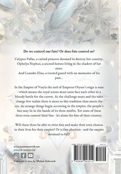 Do we control fate? Or does fate control us? Calypso Pallas, a cursed princess doomed to destroy her country. Ophelya Nephus, a second heiress living in the shadow of her sister. And Leandre Elias, a trusted guard with no memories of his past... In the Empire of Vasyla, the end of Emperor Oryon's reign is near - which means the royal scions must soon face each other in a bloody battle for the crown. As the challenge nears and the tides change few realize there is more to this tradition than meets the eye. As strange things begin occurring in the empire, the people's fate may lie in the hands of its three misfits. Yet none of these three even control their fate - let alone the fate of their country. Will these three be able to twist fate and make their own choices in their lives for their empire? Or is fate absolute - and the empire destined to fall?