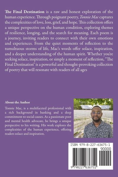 The Final Destination: A Journey Through the Human Soul Embark on a poignant exploration of the human experience with "Final Destination." This collection of poetry delves into the depths of the soul, navigating the complexities of love, loss, grief, resilience, and the enduring search for meaning. From the exhilaration of hope to the depths of despair, these verses offer a raw and honest portrayal of the human condition. With lyrical precision and emotional depth, Tonnie Mac invites readers to connect with their own experiences and find solace in the shared human journey. Discover the power of the human spirit as it navigates life's challenges, from the quiet resilience of the individual to the collective yearning for a better world. Let the words of "Final Destination" inspire, console, and uplift you.