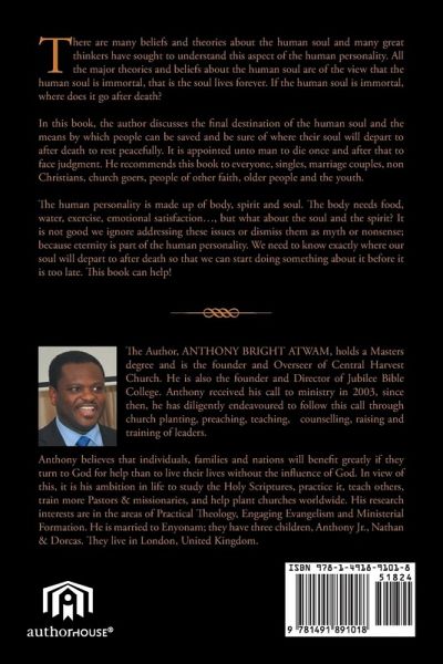 There are many beliefs and theories about the human soul and many great thinkers have sought to understand this aspect of the human personality. All the major theories and beliefs about the human soul are of the view that the human soul is immortal, that is the soul lives forever. If the human soul is immortal, where does it go after death? In this book, the author discusses the final destination of the human soul and the means by which people can be saved and be sure of where their soul will depart to after death to rest peacefully. It is appointed unto man to die once and after that to face judgment. He recommends this book to everyone, singles, marriage couples, non Christians, church goers, people of other faith, older people and the youth. The human personality is made up of body, spirit and soul. The body needs food, water, exercise, emotional satisfaction..., but what about the soul and the spirit? It is no good we ignore addressing these issues or to simply dismiss them as myth or nonsense; because eternity is part of the human personality. We need to know where exactly our soul will depart to after death.