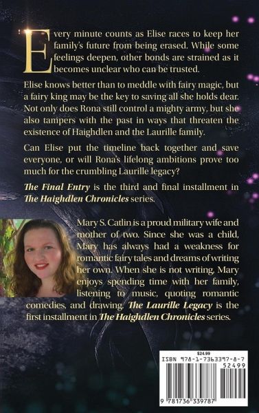 Every minute counts as Elise races to keep her family's future from being erased. While some feelings deepen, other bonds are strained as it becomes unclear who can be trusted. Elise knows better than to tamper with fairy magic, but a fairy king may be the key to saving all she holds dear. Elise refuses to lose Gavin again, but their time apart changes him in ways she does not expect. Her growing desires continue to be overshadowed by the constant reminder of the role she must play in conquering her family's biggest threat. Not only does Queen Rona still control a mighty army, but she also tampers with the past in ways that threaten the existence of Haighdlen. Can Elise mend the timeline before it is rewritten to destroy the Laurille family's legacy forever? The Final Entry is the third and final installment in The Haighdlen Chronicles series. Others in this series: The Laurille Legacy is the first book in The Haighdlen Chronicles trilogy. After learning of her royal lineage in an overthrown kingdom, Elise Laurille is sent back in time through her grandmother's diary to find the spy responsible for the family's downfall. She only needs to stay focused and not get distracted along the way. . . Restoring the Throne is the second book in The Haighdlen Chronicles trilogy. When the magical diary goes missing, along with her boyfriend, Elise ventures beyond the comforts of Haighdlen Castle with the help of her friends and a charming stranger.