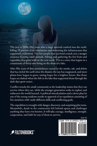 The year is 2080, fifty years after a large asteroid crashed into the earth, killing 99 percent of its inhabitants and destroying the infrastructure that supported civilization. The few people that survived scratch out a meager existence hunting small animals, fishing, and gathering the few fruits and vegetables that grow wild on the new earth. This is a story that begins in a community of thirty-two living on the shore of a lake. After fifty years of dim semidarkness caused by the smoke, ash, and debris that has circled the earth since the disaster, the sun has reappeared, and more plants have begun to grow, raising hopes for a brighter future. But those hopes are dashed when the fish in the lake that supported them through the dark days grow scarce. Conflict wracks the small community as the leadership insists that they can survive where they are, while the younger generation seeks to explore and rediscover the world beyond. A political miscalculation and a clever ploy by one of the young residents results in approval of an expedition consisting of five members with vastly different skills and conflicting goals. The expedition is wrought with danger, discovery, and surprising plot turns. Meanwhile, death in the community left behind upsets and challenges anything they have ever known. It will take courage, intelligence, strength, cooperation, and faith for any of them to survive.