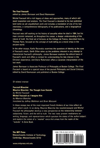The Final Foucault is devoted to his last published (and some as yet unpublished) work and includes a translation of one of his last interviews, a comprehensive bibliography of his publications, and a biographical chronology. Michel Foucault left a rich legacy of ideas and approaches, many of which still await exposition and analysis. The Final Foucault is devoted to his last published (and some as yet unpublished) work and includes a translation of one of his last interviews, a comprehensive bibliography of his publications, and a biographical chronology. Foucault was still working on his history of sexuality when he died in 1984, but his main concern remained, as throughout his career, a deeper understanding of the nature of truth. His final set of lectures at the College de France, described here by Thomas Flynn, focused on the concept of truth-telling as a moral virtue in the ancient world. In the other essays, Karlis Racevskis examines the questions of identity at the core of Foucault's work; Garth Gillan takes up the problems inherent in any attempt to characterize Foucault's philosophy; James Bernauer explores the ethical basis of Foucault's work and offers a context for understanding his late interest in the Christian experience; and Diane Rubenstein offers a Lacanian interpretation of the last work. The Final Foucault is based on a special issue of the Journal Philosophy and Social Criticism, edited by David Rasmussen and published at Boston College.