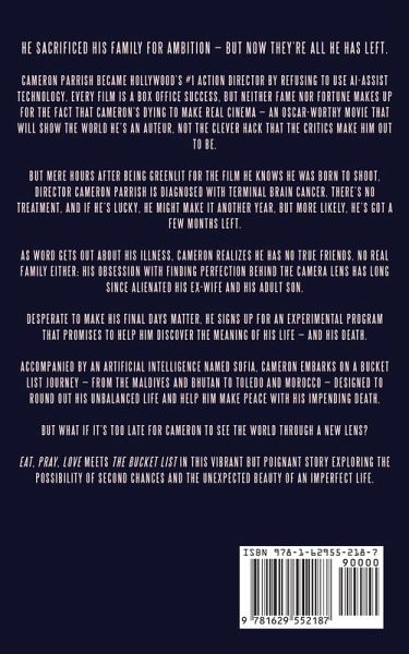 He sacrificed his family for ambition - but now they're all he has left. Cameron Parrish became Hollywood's #1 action director by refusing to use AI-assist technology. Every film is a box office success, but neither fame nor fortune makes up for the fact that Cameron's dying to make real cinema - an Oscar-worthy movie that will show the world he's an auteur, not the clever hack that the critics make him out to be. But mere hours after being greenlit for the film he knows he was born to shoot, director Cameron Parrish is diagnosed with terminal brain cancer. There's no treatment, and if he's lucky, he might make it another year, but more likely, he's got a few months left. As word gets out about his illness, Cameron realizes he has no true friends. No real family either: his obsession with finding perfection behind the camera lens has long since alienated his ex-wife and his adult son. Desperate to make his final days matter, he signs up for an experimental program that promises to help him discover the meaning of his life - and his death. Accompanied by an artificial intelligence named Sofia, Cameron embarks on a bucket list journey - from the Maldives and Bhutan to Toledo and Morocco - designed to round out his unbalanced life and help him make peace with his impending death. But what if it's too late for Cameron to see the world through a new lens? Eat, Pray, Love meets The Bucket List in this vibrant but poignant story exploring the possibility of second chances and the unexpected beauty of an imperfect life.