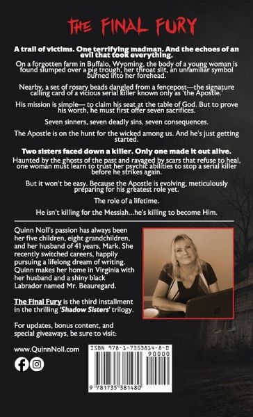A trail of victims. One terrifying madman. And the echoes of an evil that took everything. On a forgotten farm in Buffalo, Wyoming, the body of a young woman is found slumped over a pig trough, her throat slit, an unfamiliar symbol burned into her forehead. Nearby, a set of rosary beads dangled from a fencepost-the signature calling card of a vicious serial killer known only as 'the Apostle'. His mission is simple-to claim his seat at the table of God. But to prove his worth, he must first offer seven sacrifices. Seven sinners, seven deadly sins, seven consequences. The Apostle is on the hunt for the wicked among us. And he's just getting started. Two sisters faced down a killer. Only one made it out alive. Haunted by the ghosts of the past and ravaged by scars that refuse to heal, one woman must learn to trust her psychic abilities to stop a serial killer before he strikes again. But it won't be easy. Because the Apostle is evolving, meticulously preparing for his greatest role yet. The role of a lifetime. He isn't killing for the Messiah, he's killing to become Him.