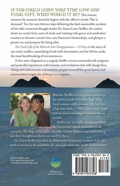 If you could leave your true love one final gift, what would it be? This intense, moment-by-moment chronicle begins with the officer's words, "She is deceased." For the next thirteen days following the fatal automobile accident of his wife, renowned thought-leader Dr. Seana Lowe Steffen, the author draws on nearly forty years of study and training with gurus and meditation teachers to discover ecstatic love, save fractured relationships, and glimpse a greater arc and purpose for being alive. The Final Gift of the Beloved: Her Disappearance-13 Days is the story of one man's sudden, astonishing brush with devastation and the Divine under the most heartbreaking of circumstances. A love story disguised as a tragedy, Steffen weaves extraordinarily poignant and powerful experiences with honesty and revelations that will change lives. Along with intense pain and emotion, prepare yourself for great beauty and transcendent insight, for nothing is as it appears.